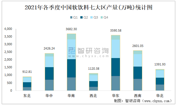 2021年各季度中國軟飲料七大區(qū)產量統(tǒng)計圖