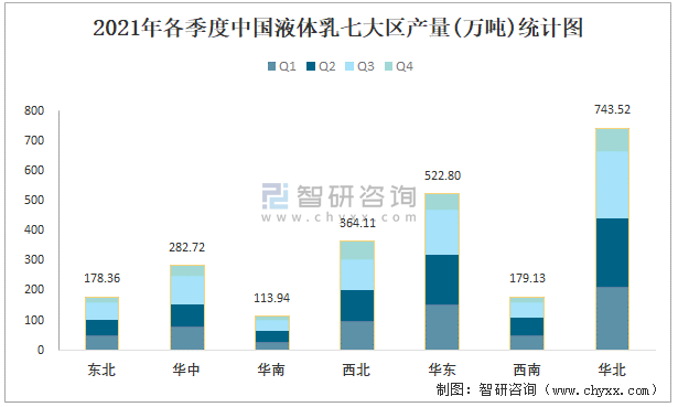 2021年各季度中國液體乳七大區產量統計圖