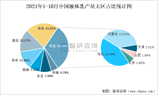 2021年1-10月中國液體乳產量大區占比統計圖
