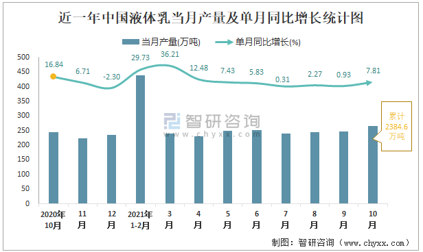 根據國家統計局數據顯示:2021年10月中國液體乳產量為267萬噸,同比增長7.81%;2021年1-10月中國液體乳累計產量為2384.6萬噸,同比增長10.48%;2015-2020年中國液體乳產量2018年跌至最低,此后逐年遞增。