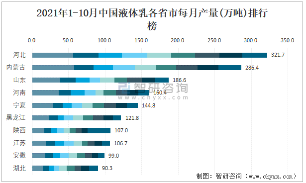 2021年1-10月中國液體乳各省市每月產量排行榜