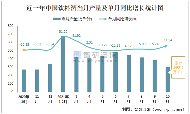 根據國家統計局數據顯示:2021年10月中國飲料酒產量為301萬千升,同比增長11.34%;2021年1-10月中國飲料酒累計產量為3953.7萬千升,同比增長4.67%;2015-2020年中國飲料酒產量逐年遞減,2020年達到最低。