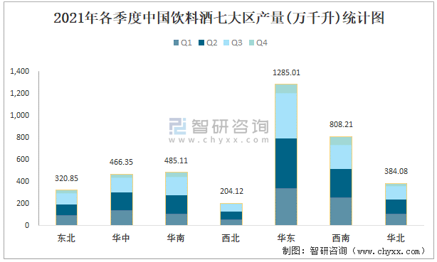 2021年各季度中國飲料酒七大區產量統計圖