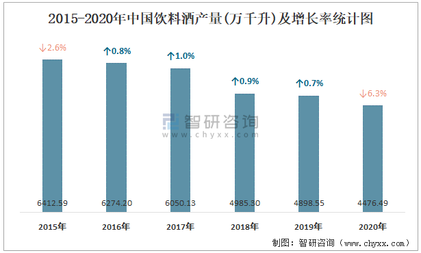 2015-2020年中國飲料酒產量及增長率統計圖