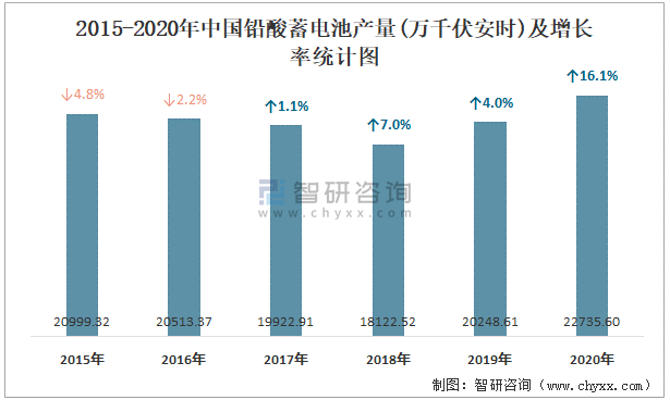 2015-2020年中國鉛酸蓄電池產(chǎn)量及增長(zhǎng)率統(tǒng)計(jì)圖