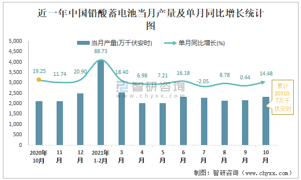 2021年1-10月中國鉛酸蓄電池產(chǎn)量為20310.7萬千伏安時(shí) 同比增長(zhǎng)15.13%