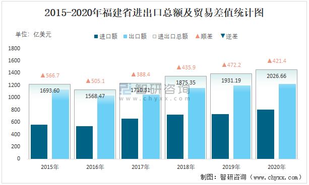 2015-2020年福建省進(jìn)出口總額及貿(mào)易差值統(tǒng)計(jì)圖