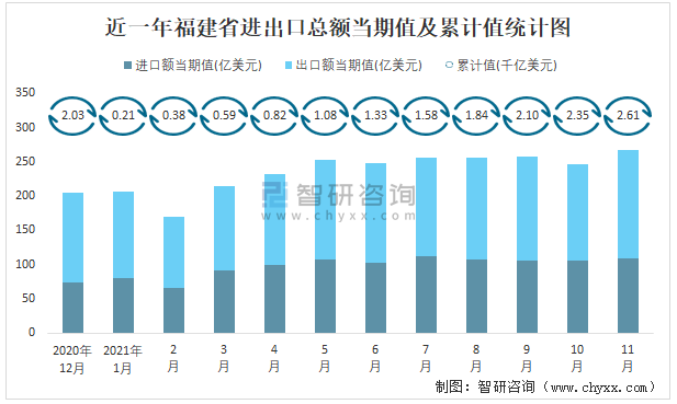 近一年福建省進(jìn)出口總額當(dāng)期值及累計(jì)值統(tǒng)計(jì)圖