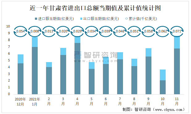 近一年甘肅省進出口總額當期值及累計值統計圖
