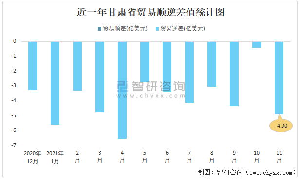 近一年甘肅省貿易順逆差值統計圖