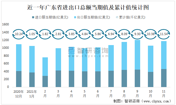 2021年11月廣東省進出口總額為1175.51億美元,其中進口額為464.59億美元,出口額為710.92億美元;2021年1-11月進出口總額為11.54千億美元,進出口總額(以美元計價)累計同比增長26.3%,其中累計進口額占比38.83%,累計出口額占比61.17%。2015-2020年廣東省進出口總額在2018年達到最大值,此后逐年遞減;2015-2020年廣東省進出口貿易差值總體呈現貿易順差狀態。