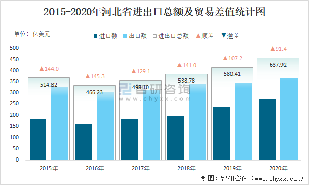 2015-2020年河北省進(jìn)出口總額及貿(mào)易差值統(tǒng)計(jì)圖