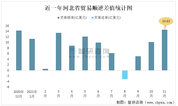 近一年河北省貿(mào)易順逆差值統(tǒng)計(jì)圖