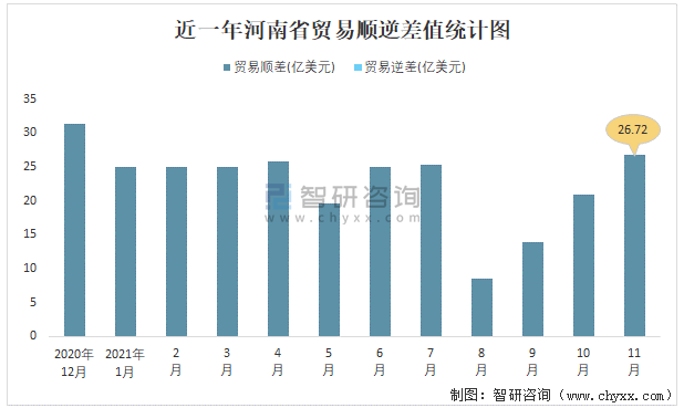 近一年河南省貿(mào)易順逆差值統(tǒng)計(jì)圖