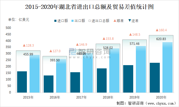 2015-2020年湖北省進出口總額及貿易差值統計圖