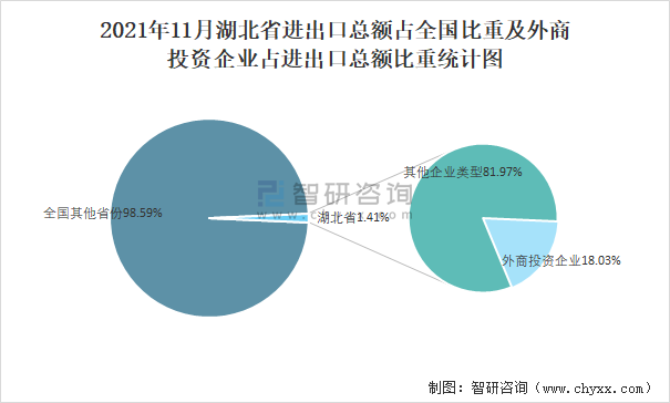 2021年11月湖北省進出口總額占全國比重及外商投資企業占進出口總額比重統計圖