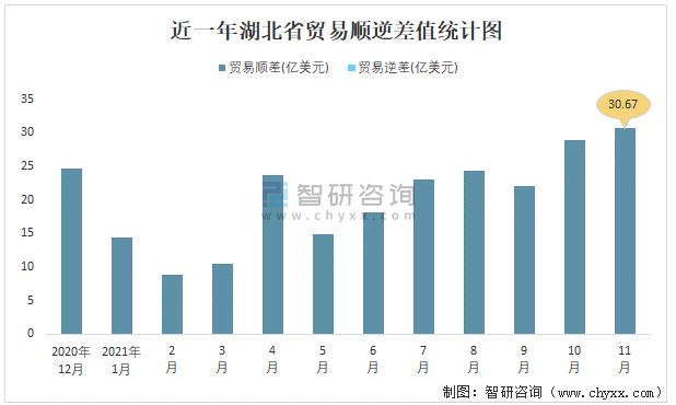 近一年湖北省貿易順逆差值統計圖