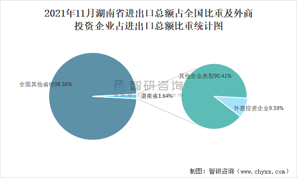 2021年11月湖南省進(jìn)出口總額占全國比重及外商投資企業(yè)占進(jìn)出口總額比重統(tǒng)計圖