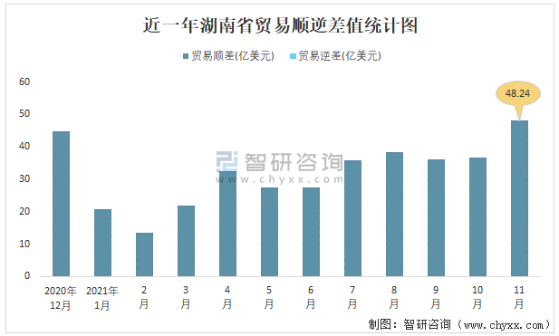 近一年湖南省貿(mào)易順逆差值統(tǒng)計圖