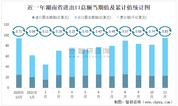 近一年湖南省進(jìn)出口總額當(dāng)期值及累計值統(tǒng)計圖