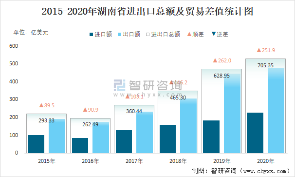 2015-2020年湖南省進(jìn)出口總額及貿(mào)易差值統(tǒng)計圖