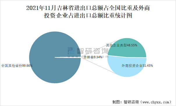 2021年11月吉林省進(jìn)出口總額占全國(guó)比重及外商投資企業(yè)占進(jìn)出口總額比重統(tǒng)計(jì)圖