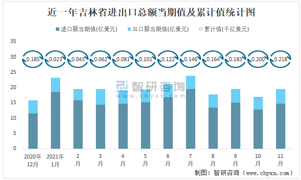 近一年吉林省進(jìn)出口總額當(dāng)期值及累計(jì)值統(tǒng)計(jì)圖