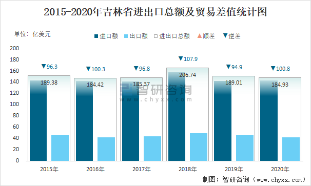 2015-2020年吉林省進(jìn)出口總額及貿(mào)易差值統(tǒng)計(jì)圖