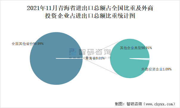 2021年11月青海省進出口總額占全國比重及外商投資企業占進出口總額比重統計圖