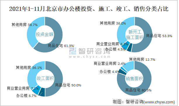 2021年1-11月北京市辦公樓投資、施工、竣工、銷售分類占比