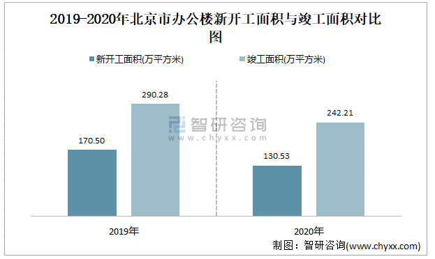 2019-2020年北京市辦公樓新開工面積與竣工面積對比圖