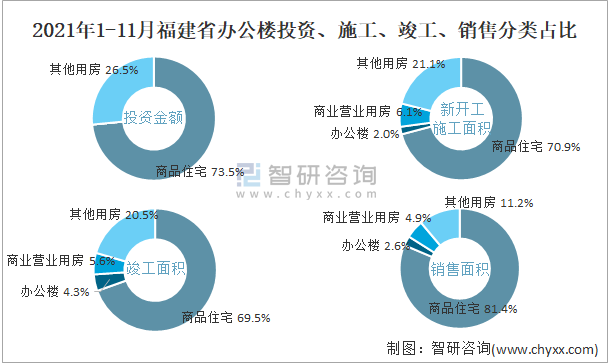 根據國家統計局數據統計可知:2021年1-11月福建省房地產開發企業在包括辦公樓在內的其他用房投資金額占比為26.5%(注:只有投資金額中其他用房包含辦公樓、商業營業用房),辦公樓的新開工面積與竣工面積所占比重差異不大,從銷售面積來看,辦公樓銷售面積占比少于商業營業用房銷售面積占比。