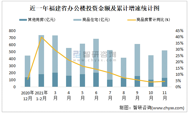 根據國家統計局數據統計可知:2021年11月福建省房地產開發投資商品房投資金額為520.65億元,其中包括辦公樓、商業營業用房等其他用房129.12億元(注:辦公樓、商業營業用房未分開統計);2021年1-11月福建省房地產開發投資包括辦公樓在內的其他用房累計金額為1550.11億元。