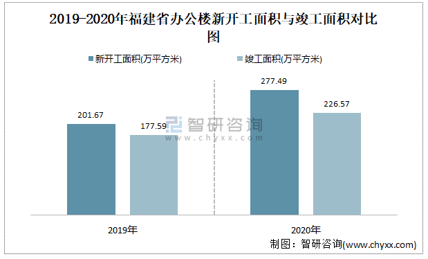 2019-2020年福建省辦公樓新開工面積與竣工面積對比圖