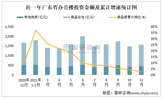 近一年廣東省辦公樓投資金額及累計(jì)增速統(tǒng)計(jì)圖