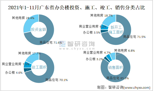 根據(jù)國(guó)家統(tǒng)計(jì)局?jǐn)?shù)據(jù)統(tǒng)計(jì)可知:2021年1-11月廣東省房地產(chǎn)開(kāi)發(fā)企業(yè)在包括辦公樓在內(nèi)的其他用房投資金額占比為28.4%(注:只有投資金額中其他用房包含辦公樓、商業(yè)營(yíng)業(yè)用房),辦公樓的新開(kāi)工面積與竣工面積所占比重差異不大,從銷售面積來(lái)看,辦公樓銷售面積占比少于商業(yè)營(yíng)業(yè)用房銷售面積占比。