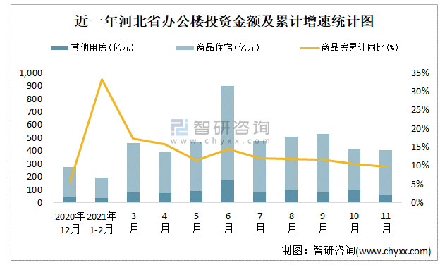 根據國家統計局數據統計可知:2021年11月河北省房地產開發投資商品房投資金額為406.77億元,其中包括辦公樓、商業營業用房等其他用房64.01億元(注:辦公樓、商業營業用房未分開統計);2021年1-11月河北省房地產開發投資包括辦公樓在內的其他用房累計金額為871.39億元。