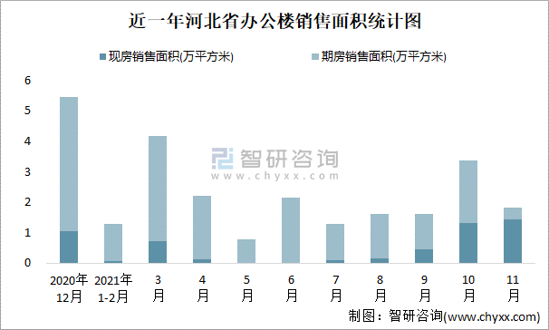 根據國家統計局數據可知:2021年11月河北省辦公樓銷售面積為1.83萬平方米(其中銷售現房1.42萬平方米,期房0.41萬平方米);2021年1-11月河北省辦公樓累計銷售面積為20.22萬平方米;近一年河北省辦公樓期房銷售面積遠高于現房銷售面積。