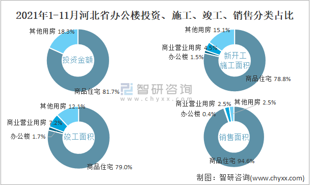 根據國家統計局數據統計可知:2021年1-11月河北省房地產開發企業在包括辦公樓在內的其他用房投資金額占比為18.3%(注:只有投資金額中其他用房包含辦公樓、商業營業用房),辦公樓的新開工面積與竣工面積所占比重差異不大,從銷售面積來看,辦公樓銷售面積占比少于商業營業用房銷售面積占比。