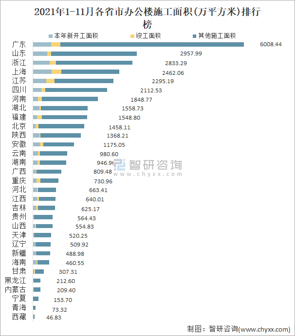 2021年1-11月各省市辦公樓施工面積(萬平方米)排行榜