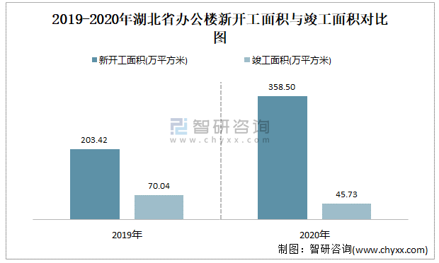2019-2020年湖北省辦公樓新開工面積與竣工面積對比圖