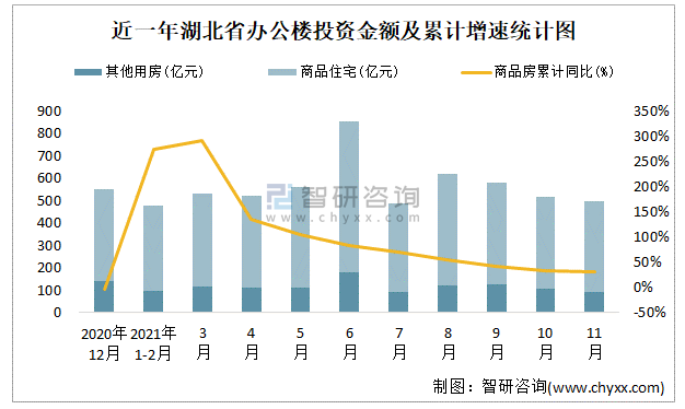 近一年湖北省辦公樓投資金額及累計增速統(tǒng)計圖