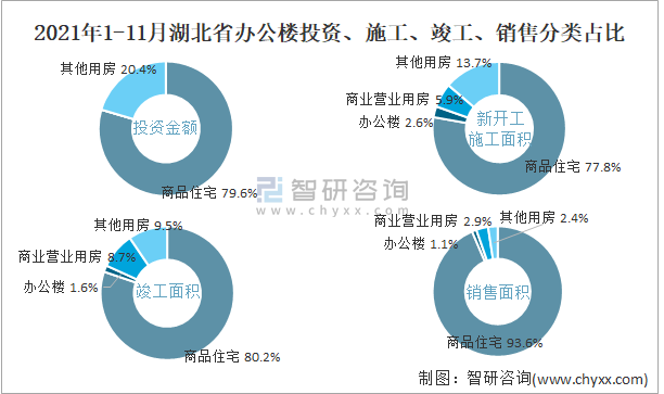 根據(jù)國家統(tǒng)計局數(shù)據(jù)統(tǒng)計可知:2021年1-11月湖北省房地產(chǎn)開發(fā)企業(yè)在包括辦公樓在內(nèi)的其他用房投資金額占比為20.4%(注:只有投資金額中其他用房包含辦公樓、商業(yè)營業(yè)用房),辦公樓的新開工面積與竣工面積所占比重差異不大,從銷售面積來看,辦公樓銷售面積占比少于商業(yè)營業(yè)用房銷售面積占比。