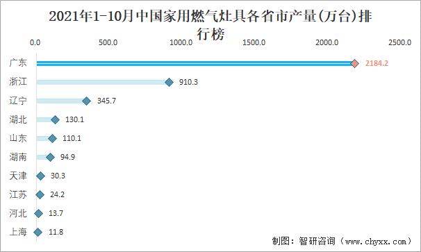 2021年1-10月中國家用燃氣灶具各省市產量排行榜