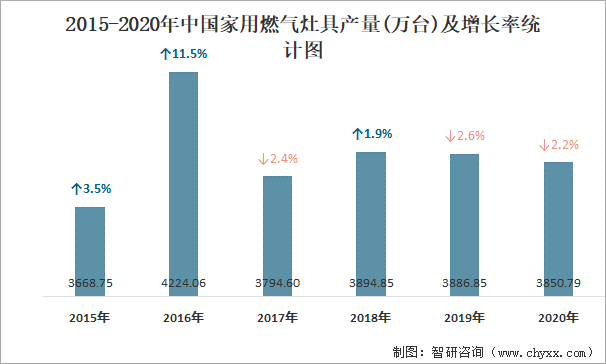 2015-2020年中國家用燃氣灶具產量及增長率統計圖