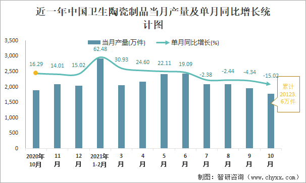 根據(jù)國家統(tǒng)計(jì)局?jǐn)?shù)據(jù)顯示:2021年10月中國衛(wèi)生陶瓷制品產(chǎn)量為1780萬件,同比下降15.02%;2021年1-10月中國衛(wèi)生陶瓷制品累計(jì)產(chǎn)量為20123.6萬件,同比增長(zhǎng)12.61%;2015-2020年中國衛(wèi)生陶瓷制品產(chǎn)量2019年達(dá)到最高,次年大幅度下滑。