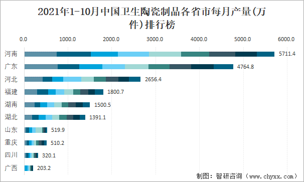 2021年1-10月中國衛(wèi)生陶瓷制品各省市每月產(chǎn)量排行榜