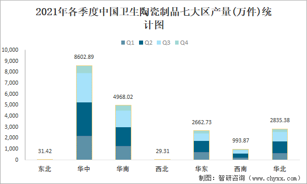 2021年各季度中國衛(wèi)生陶瓷制品七大區(qū)產(chǎn)量統(tǒng)計(jì)圖