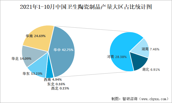 2021年1-10月中國衛(wèi)生陶瓷制品產(chǎn)量大區(qū)占比統(tǒng)計(jì)圖