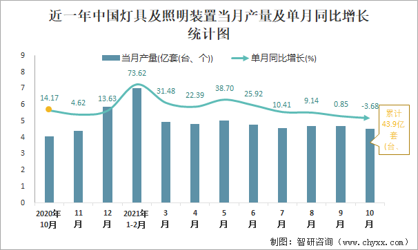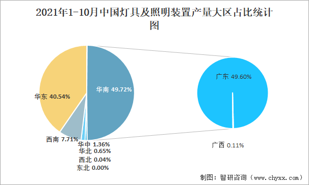2021年1-10月中國燈具及照明裝置產量為43.9億套(臺、個) 華南地區產量最高(占比49.72%)
